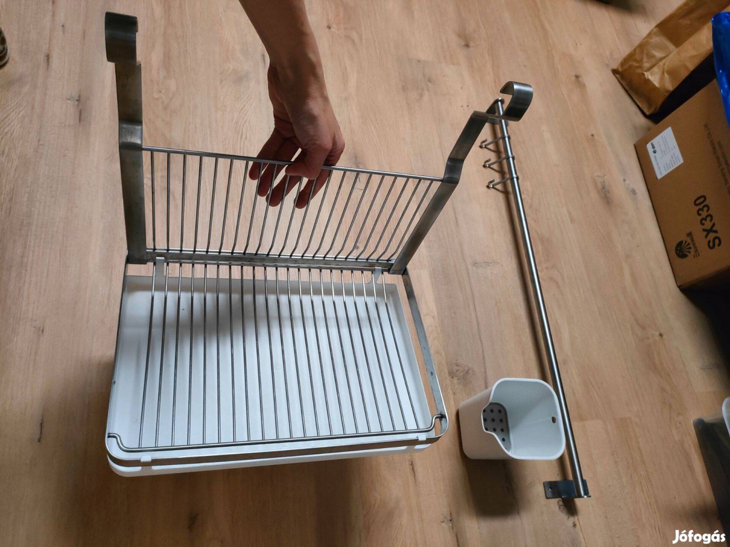 Fehér Ikea edényszárító eladó a kiegészítőkkel együtt (evőeszköztartó, kampók).