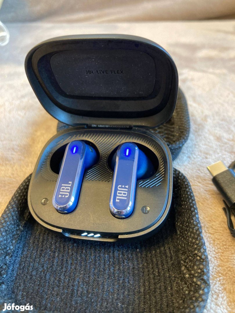 Eredeti JBL Live Flex bluetooth fülhallgató szép állapotban, cipzáras tokakl, töltőkábellel, az eredeti kék tok elveszett így feketét kapott helyette.