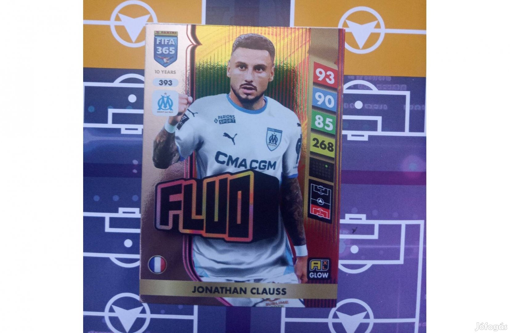 Eladó a képen látható Panini FIFA 365 Adrenalyn 2025 Jonathan Clauss (Olympique de Marseille) 393-s sorszámú Fluo kártya.