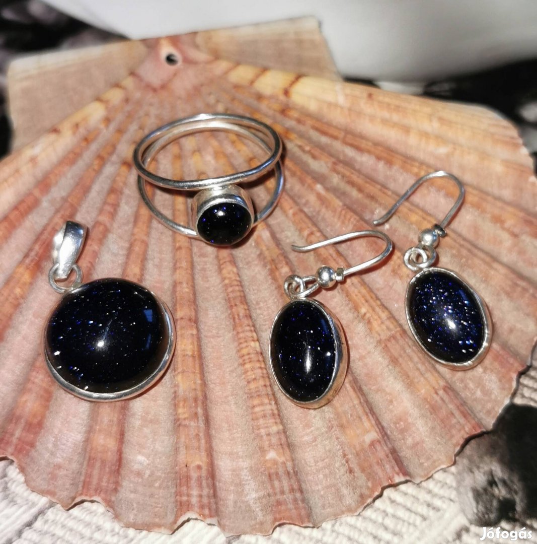 Csillogó kék homokkő ezüstözött ékszerszett, nagyon szép. Medál +fülbevaló +gyűrű. Foxposttal tudom küldeni, vagy postán, előre utalás után. A szállítás díja a vevő költsége.