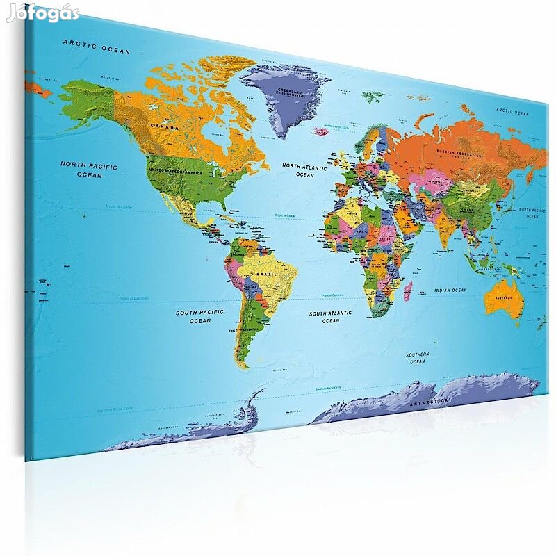 A magas minőségű "Színes világtérkép kék óceánokkal" képet speciális flíz vászonra nyomtatjuk. Ez a sok, boltunkban megrendelhető eredeti minták egyike.