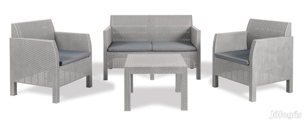 A szett két kényelmes fotelt, egy kétszemélyes kanapét és egy asztalt tartalmaz, a garnitúrát úgy tervezték, hogy kényelmes ülő- és kikapcsolódást kínáljon négy személy számára, legyen szó reggeli kávéról a teraszon vagy délutáni teáról a kertben.