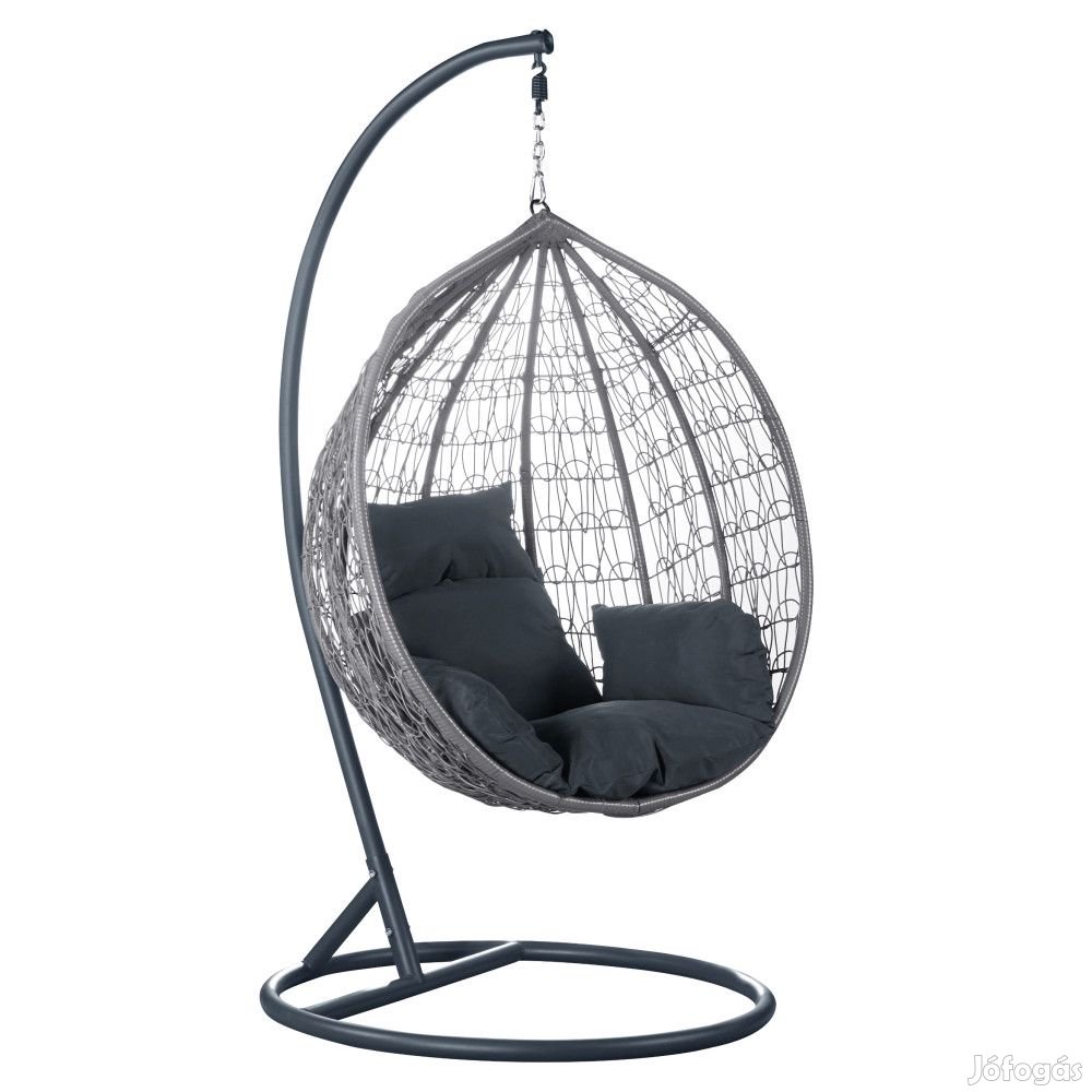 A függőfotel műrattanból készült szürke színkivitelben. A szürke színű fém szerkezet is hozzájárul a fotel általános stabilitásához. A fotel szabadon van felfüggesztve, ami lehetővé teszi a gyengéd hintázást. A kényelmet a szürke színű párnák teszik teljessé.