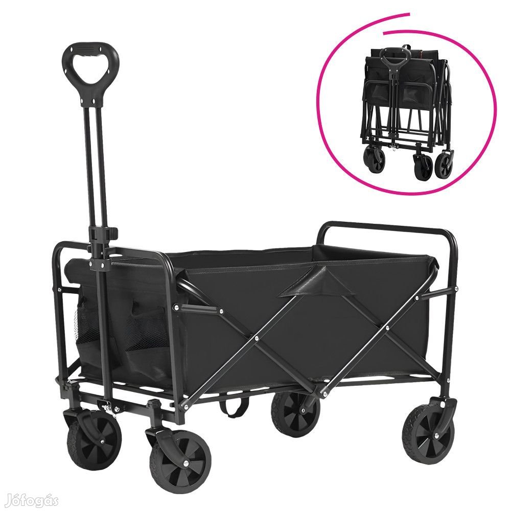 Anyag: acél/Oxford szövet A szövet kopásállósága a Martindale teszt szerint: 7 600 kopás Szín: fekete Méretek (SzxMéxMa): 45x73,5x64/87 cm Összecsukott kocsi méretei (SzxMéxMa): 45x12,5x64 cm Teherbírás: 100 kg Súly: 5 kg Térfogat: 60 l Praktikus Összecsukható Állítható magasságú fogantyú 2 fix és 2 forgó kerék Kerekek átmérője: 12 cm Levehető szövetkosár 2 oldalsó zseb Egyszerű kezelés és tárolás Egészben szállítva További információkért kattintson ide: