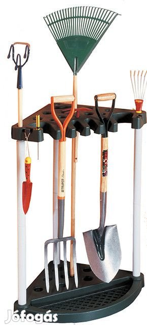 Ez a műanyag kerti eszköz/szerszámtartó kivételesen strapabíró és funkcionális, mely a sarokba állítva kis helyet foglal, mégis több szerszám tárolására szolgál.
