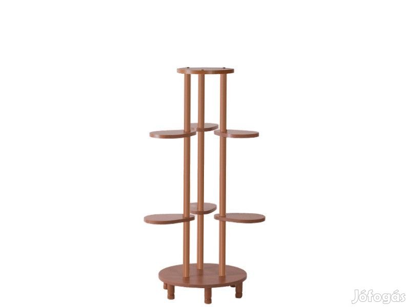 Közepes méretű, klasszikus megjelenésű fa virágtartó állvány fóliázott polcokkal, henger alakú esztergált rudakkal.