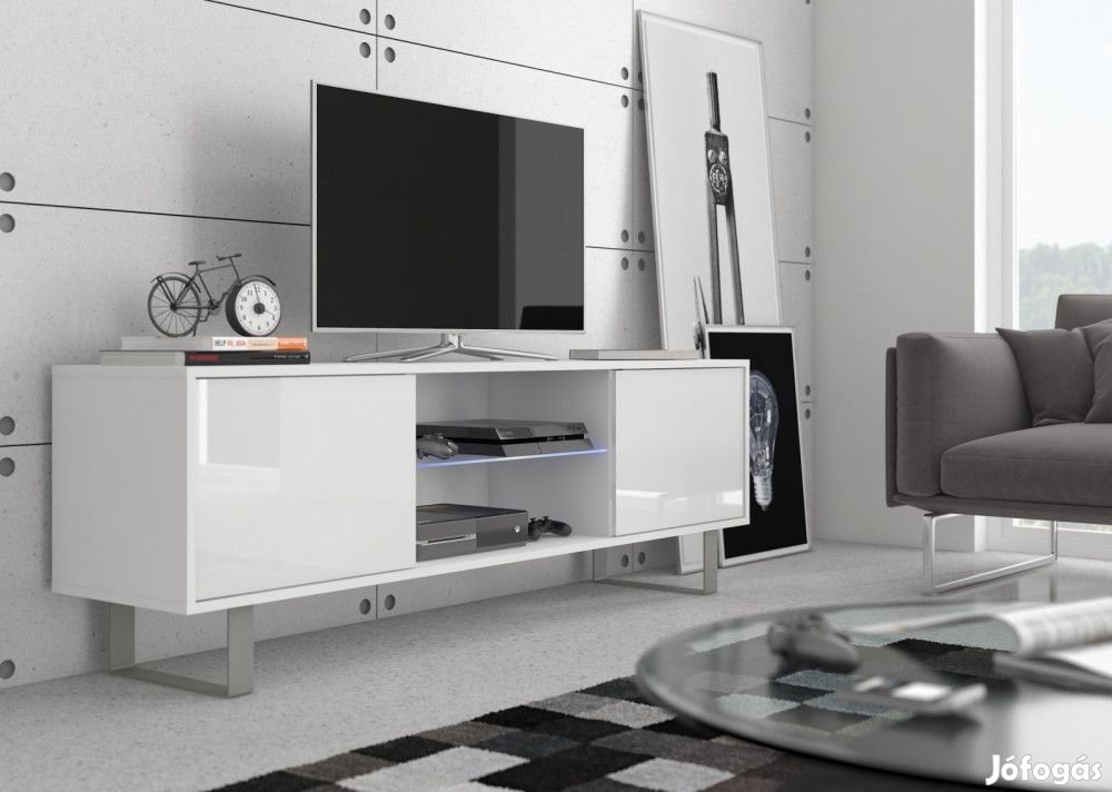 TV-állvány 2 ajtóval, az ajtók mögött polcokkal, valamint nyitott üvegpolccal, fehér és fényes fehér színben. További információkért kattintson ide: