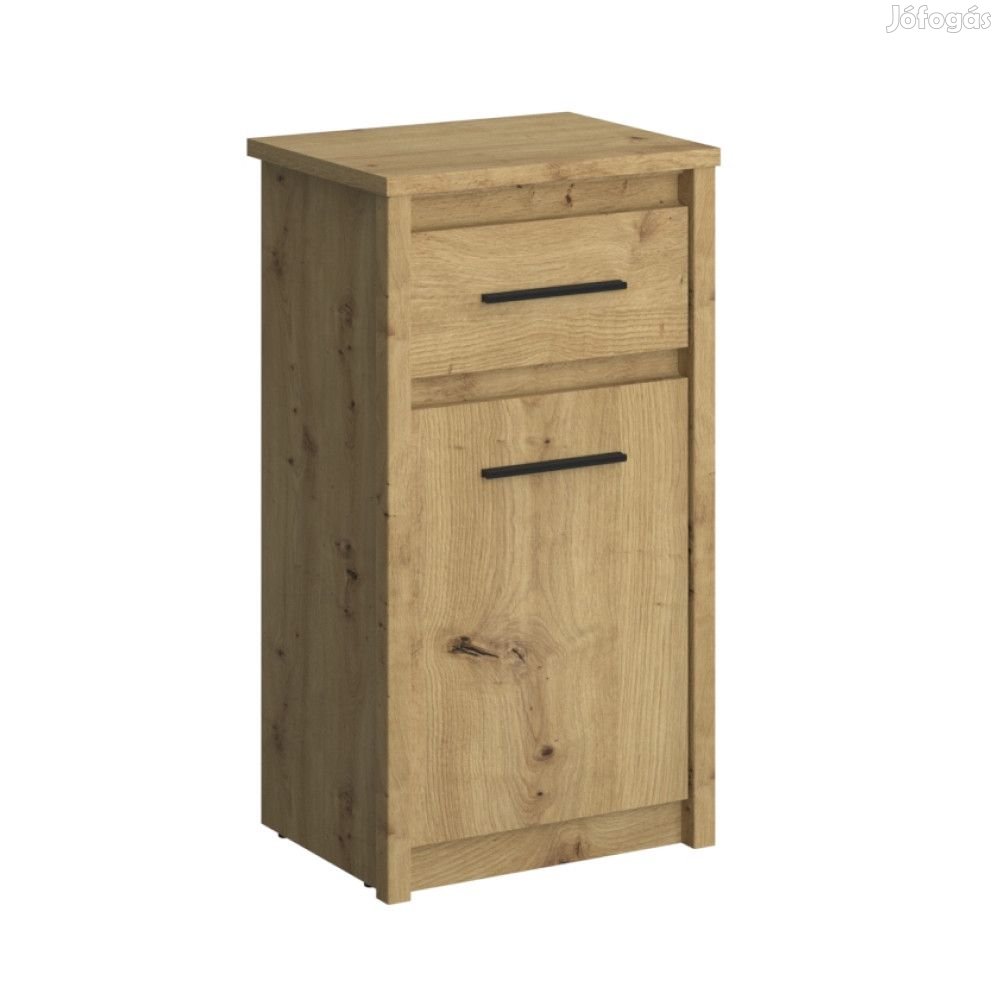 Ez a komód bőséges tárhelyet biztosít egy fiók és ajtós szekrény formájában. A szekrény polcos, két tárolófelületre osztja a teret. Ez a szekrény elrejti a személyes dolgait vagy dokumentumait.