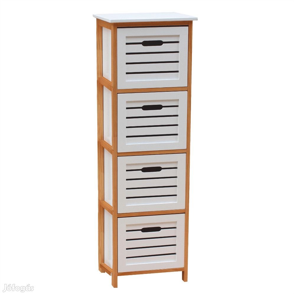 Anyag: MDF/masszív fa Szín: fehér/natúr Méretek (SzéxMéxMa): 32x30x109 cm Négy fiók Fiók külső méretei (SzxMéxMa): 25,6x27,7x23,2 cmFiók belső méretei (SzxMéxMa): 23,6x25,2x22 cmBontásban szállítva. További információkért kattintson ide:
