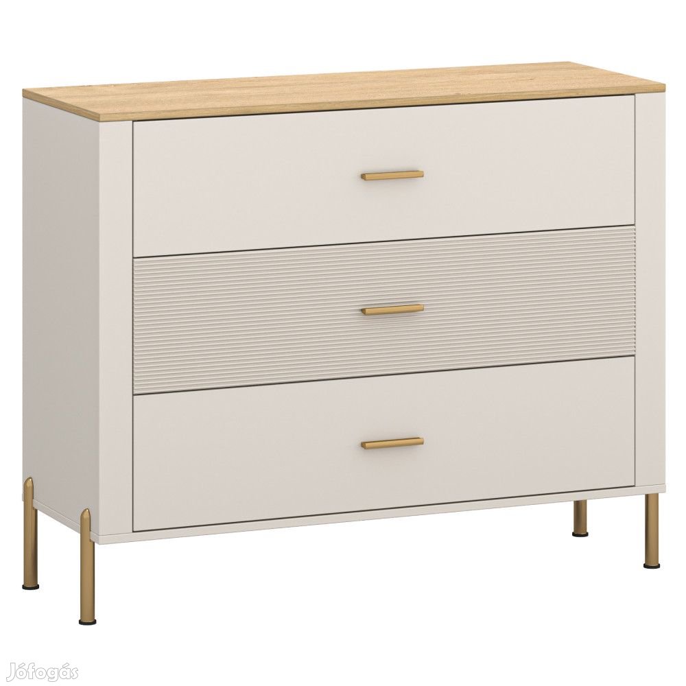 Anyag: laminált DTD/fóliázott MDF/PVCSzín: kasmír/kő tölgyMéretek (SzxMéxMa): 116x42,3x93,5 cmAnyagvastagság: 1,6 cmHárom fiókFiók teherbírása: 3 kgFogantyúvalFogantyú anyaga: fémFogantyú színe: aranyLábakonLábak anyaga: fémLábak színe: aranyLábak magassága: 15 cmDekoratív marású ajtókModern dizájnJavasoljuk a falhoz rögzítésétSzétszerelve szállítva További információkért kattintson ide:
