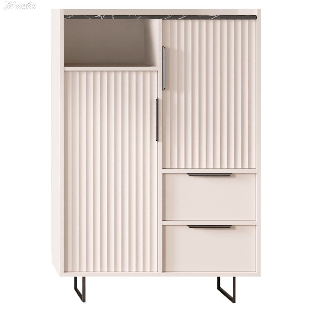 Anyag: laminált DTD/fóliázott MDFSzín: kasmír/fekete márványMéretek (SzxMéxMa): 85x42x125 cmAnyagvastagság: 1,6 cmKétajtósKét fiókKét szekrényNyitott tárhelyPolcosPolc teherbírása: 4 kgFiókok teherbírása: 2 kgFelső lap teherbírása: 15 kgFogantyúkkalFogantyúk anyaga: fémFogantyúk színe: feketeLábakonLábak anyaga: fémLábak színe: feketeLábak magassága: 12 cmDekoratív ajtókÉlek: hőre keményedő polimerekkel bevont papírDTD vastagsága - hátlap/fiókok alja: 0,3 cmHátlap/fiókok aljának színe: fehérTeljesen kihúzható golyós sínZsanérokModern dizájnFalhoz rögzítés ajánlottSzétszerelve szállítva További információkért kattintson ide:
