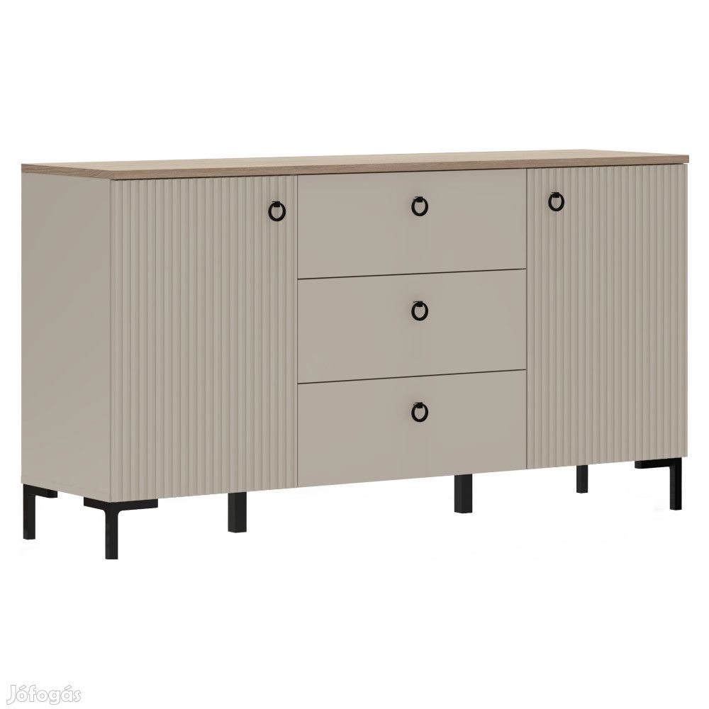 Anyag: laminált DTD/fóliázott MDFSzín: szürkésbarna Taupe/silverjack tölgyMéretek (SzxMéxMa): 150x40,7x80,9 cmDTD anyagvastagsága: 1,6-1,8 cmMDF anyagvastagsága: 1,9 cmKétajtósPolcosHárom fiókFiók méretei (SzxMa): 59,6x22 cmFelső lap teherbírása: 10 kgPolc teherbírása: 5 kgFiók teherbírása: 3 kgFogantyúkkalFogantyú anyaga: fémFogantyú színe: matt feketeLábakonLábak magassága: 12 cmLábak anyaga: műanyagLábak színe: matt feketeDekoratív marású ajtókModern dizájnJavasoljuk a falhoz rögzítéstSzétszerelve szállítva További információkért kattintson ide: