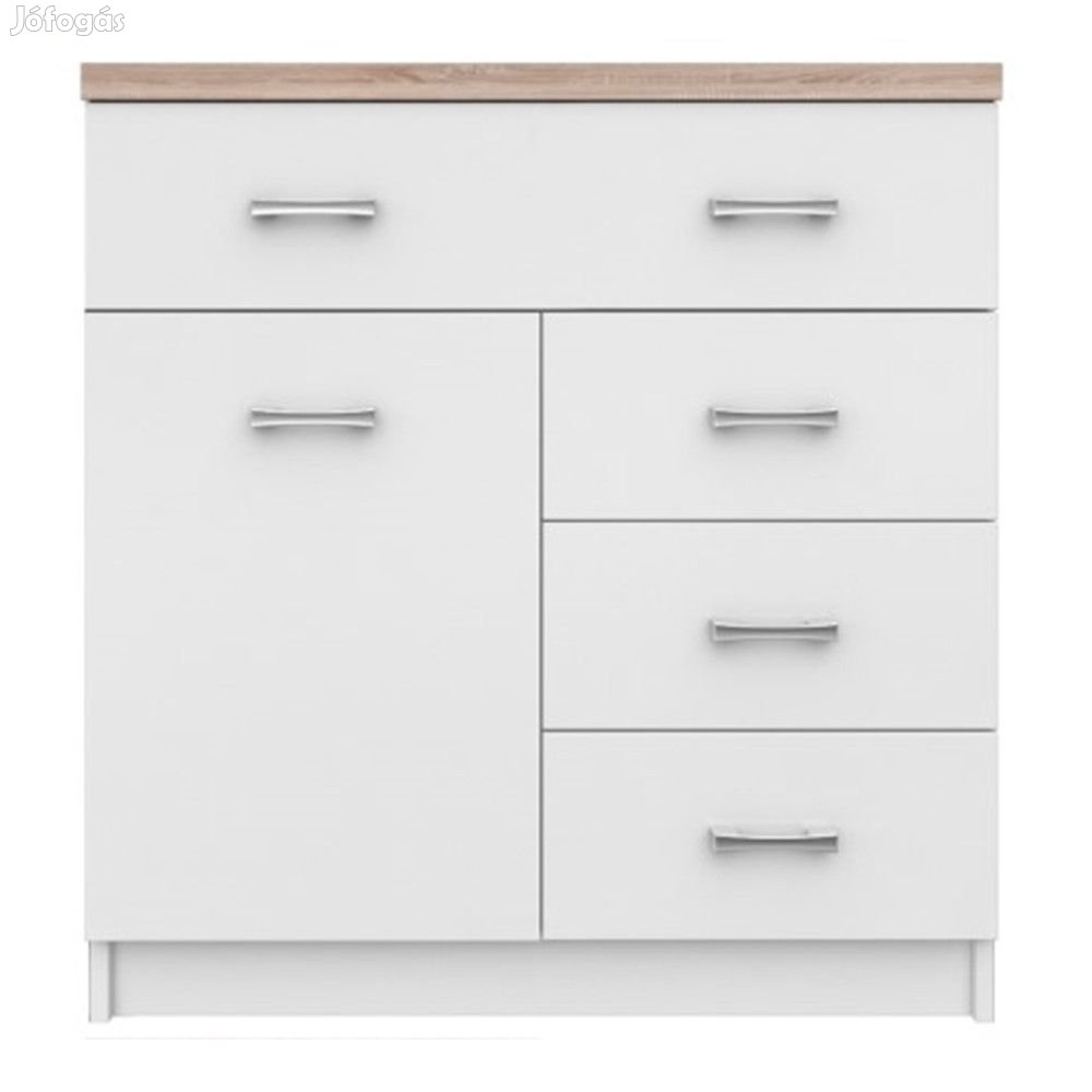Egyajtós, az ajtók felett egy fiók található. A jobb oldalon három egyforma mélységű fiók helyezkedik el.