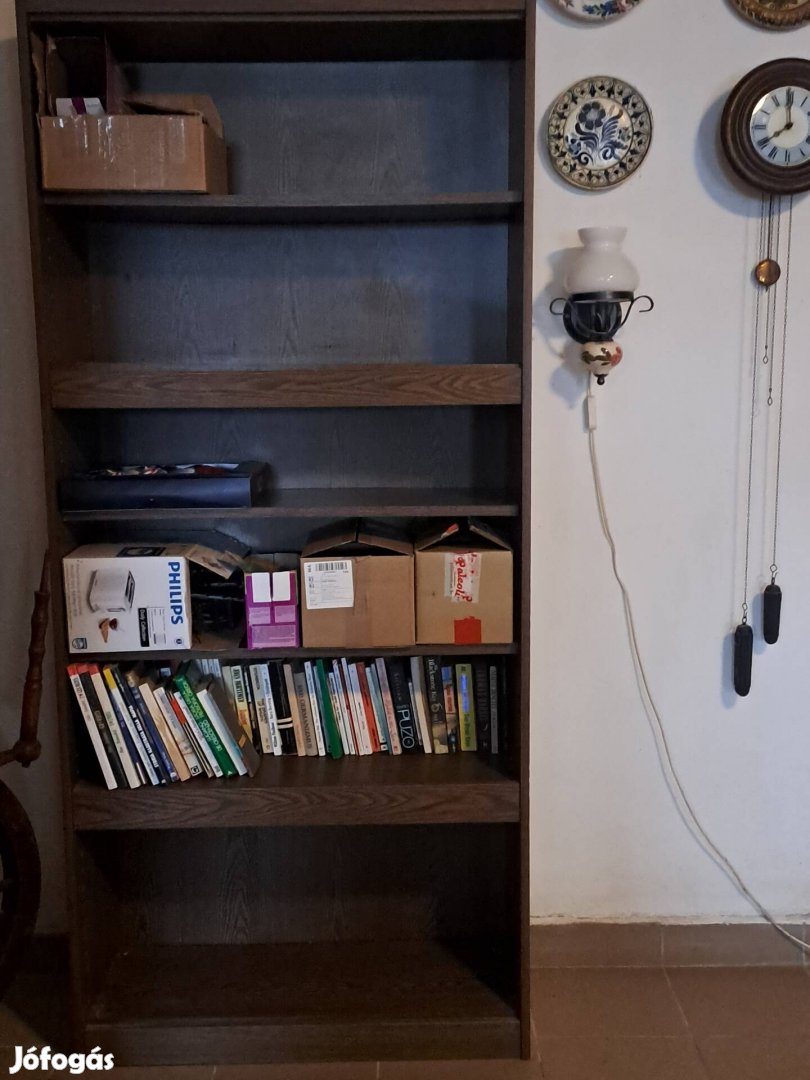 Sötétbarna, matt, jó állapotú használt könyvespolc. A polcok kivehetők.