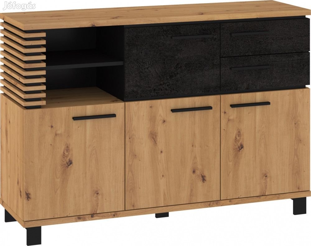 Komód 4 ajtóval, 2 fiókkal, az ajtók mögött polcokkal és nyitott polcokkal, artisan tölgy, beton fekete és fekete színben. További információkért kattintson ide: