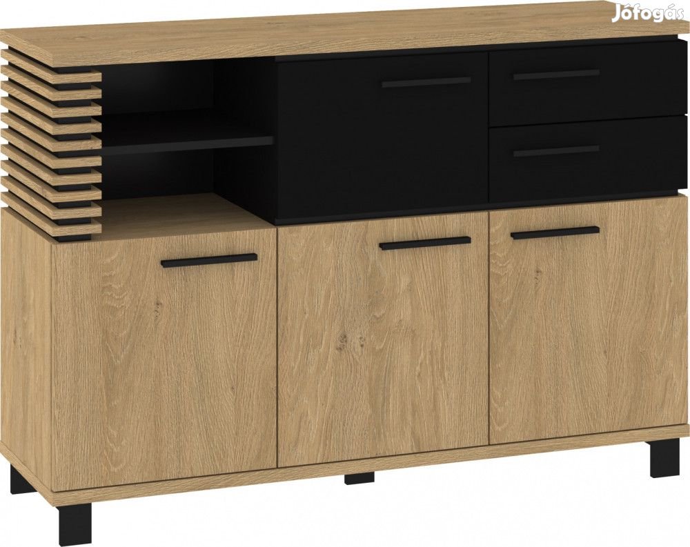 Komód 4 ajtóval, 2 fiókkal, az ajtók mögött polcokkal és nyitott polcokkal, stone tölgy, fényes fekete és fekete színben. További információkért kattintson ide: