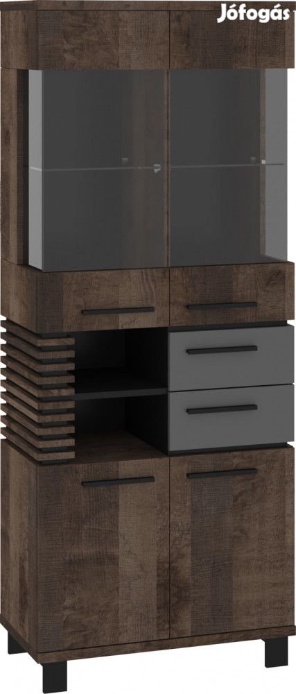 Felül 2-ajtós üveges vitrines szekrény 1-1 üvegpolccal, alul 2-ajtós 2-fiókos szekrény az ajtók mögött polcokkal, és nyitott polcokkal, grange tölgy, szürke és fekete színben. További információkért kattintson ide: