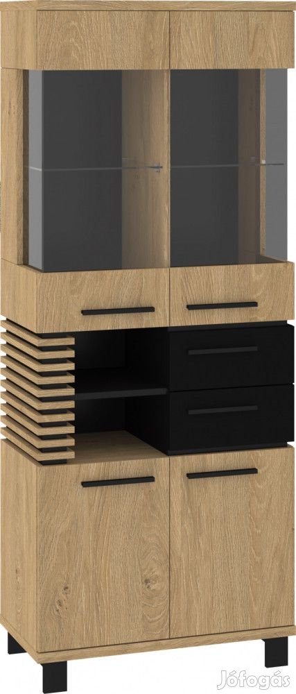 Felül 2-ajtós üveges vitrines szekrény 1-1 üvegpolccal, alul 2-ajtós 2-fiókos szekrény az ajtók mögött polcokkal, és nyitott polcokkal, stone tölgy, fényes fekete és fekete színben. További információkért kattintson ide: