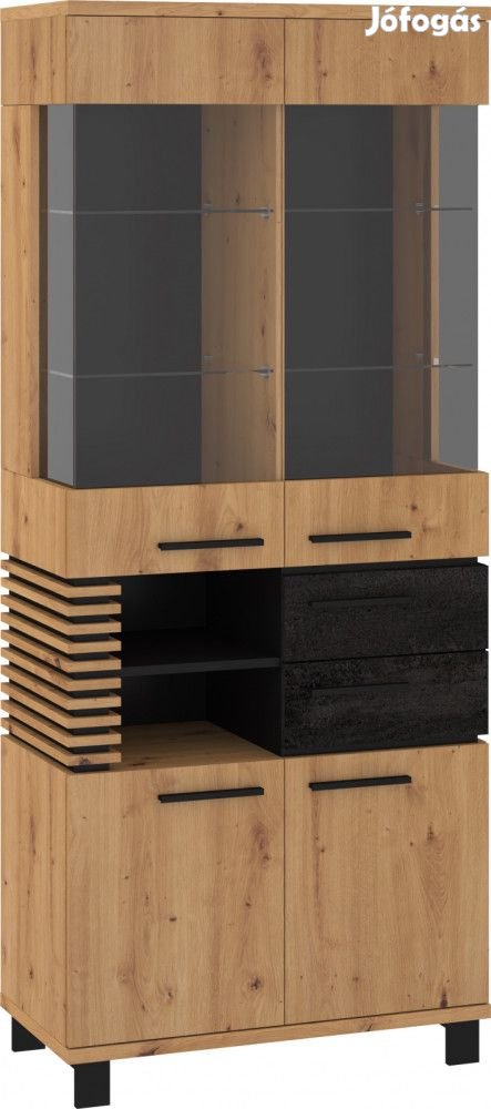 Felül 2-ajtós üveges vitrines szekrény 1-1 üvegpolccal, alul 2-ajtós 2-fiókos szekrény az ajtók mögött polcokkal, és nyitott polcokkal, artisan tölgy, beton fekete és fekete színben. További információkért kattintson ide: