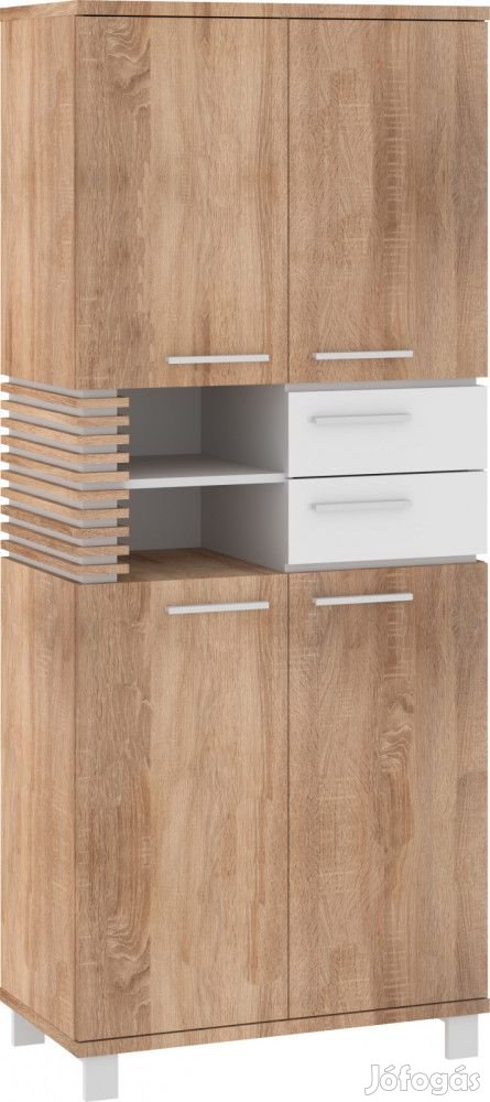 Könyvespolc 4 ajtóval, 2 fiókkal, az ajtó mögött polcokkal és nyitott polcokkal, világos sonoma tölgy, fényes fehér és fehér színben. További információkért kattintson ide: