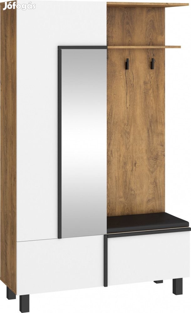 Előszobafal vállfatartós felül polcos szekrénnyel, tükörrel, alul lenyílós cipőtartó szekrényekkel, fogasokkal, ülőkés szekrénnyel és ülőpárnával, burgundy tölgy és fehér színben, fekete huzattal. További információkért kattintson ide: