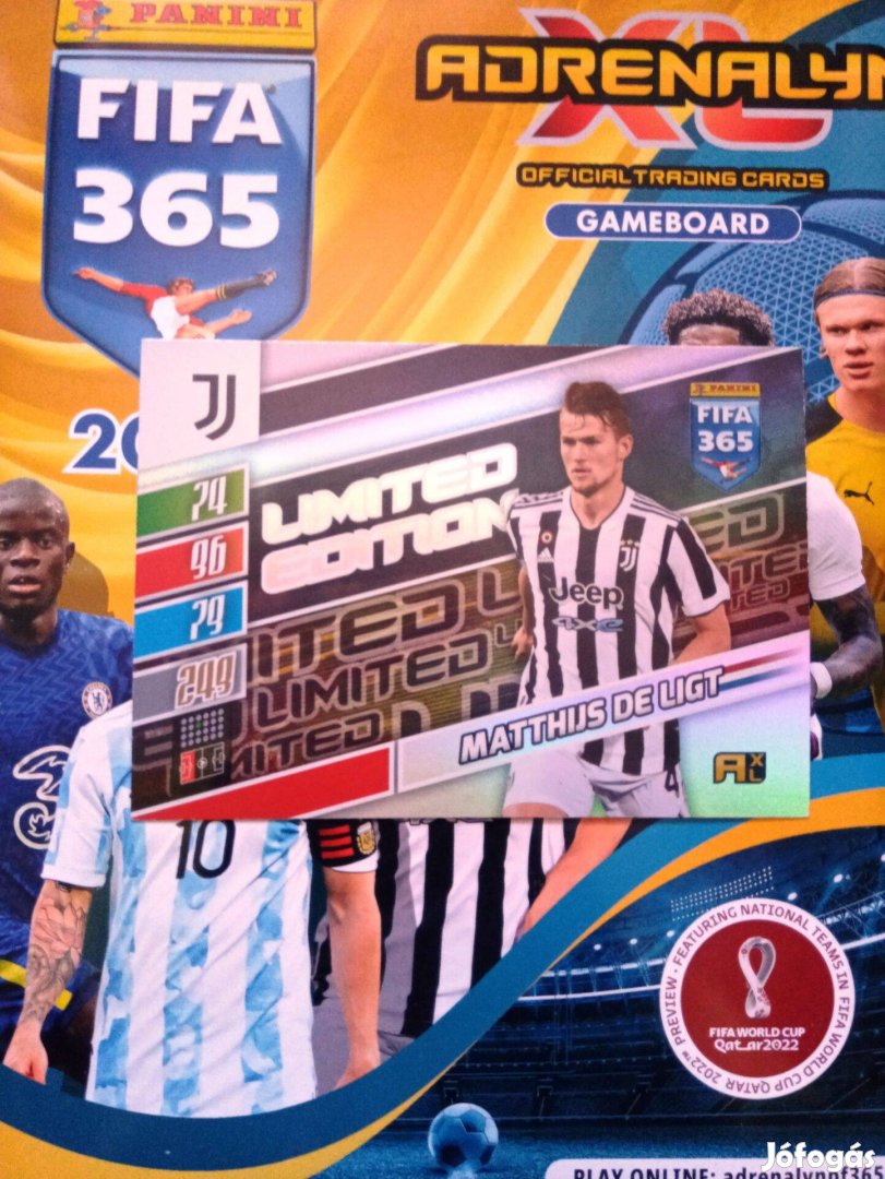 Eladó a képen látható Panini Fifa 365 2022 Adrenalyn Matthijs de Ligt (Juventus) XXL Limited (nagyméretű) kártya.