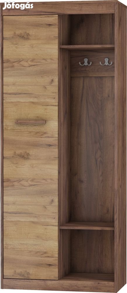 Előszoba szekrény 1-ajtós, végig polcos szekrénnyel, nyitott ruhaakasztókkal és nyitott polcokkal, tobacco tölgy és arany tölgy színben. További információkért kattintson ide: