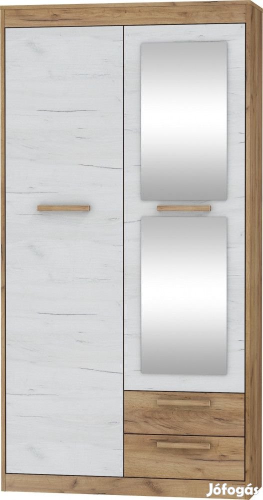 Gardróbszekrény 2 ajtóval, 2 fiókkal, osztott belsővel, bal oldalon felül polccal és vállfatartóval, a jobb oldalon végig polcokkal, a kisebb ajtón tükrökkel, arany tölgy és fehér tölgy színben. További információkért kattintson ide: