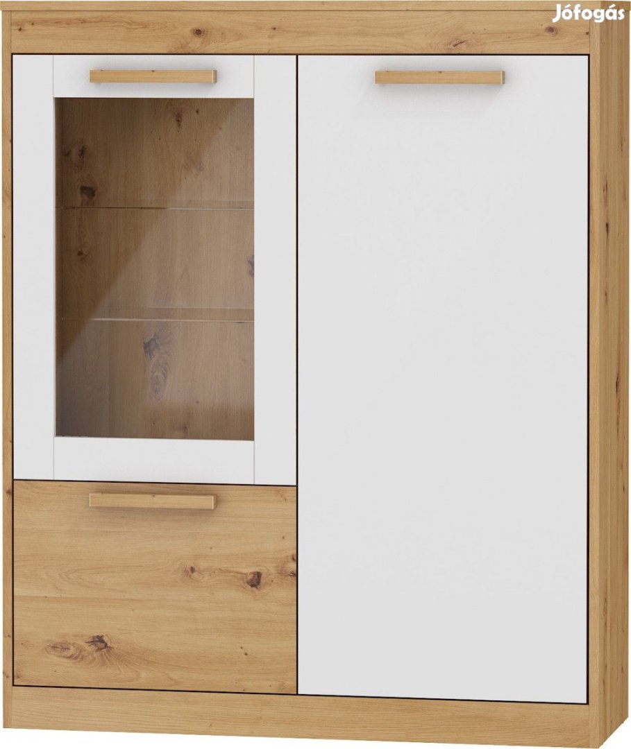 Osztottan 1 üvegajtós és 2 teli ajtós vitrines szekrény üvegpolcokkal és az ajtók mögött polcokkal, artisan tölgy és fényes fehér színben. További információkért kattintson ide: