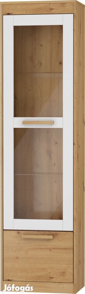Felül 1-ajtós üveges vitrines, alul 1-ajtós lenyílós szekrény üvegpolcokkal, artisan tölgy és fényes fehér színben. További információkért kattintson ide: