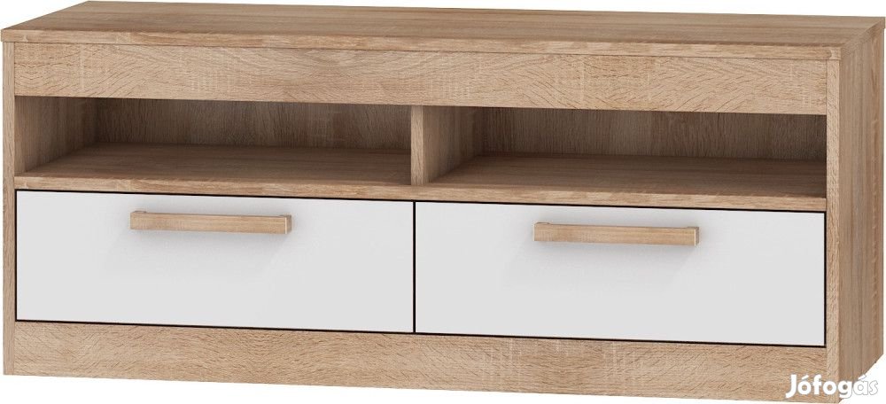 TV-állvány 2 fiókkal és nyitott polcokkal, világos sonoma tölgy és fényes fehér színben. További információkért kattintson ide: