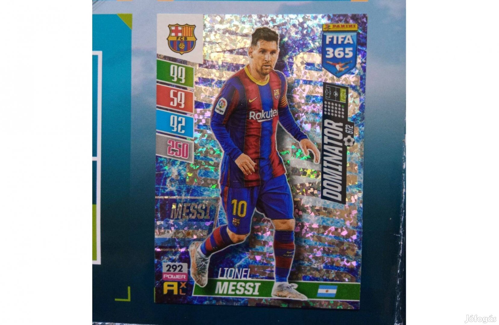 Eladó a képen látható Panini Fifa 365 2022 Adrenalyn Lionel Messi (FC Barcelona) 292-s sorszámú Dominator kártya.