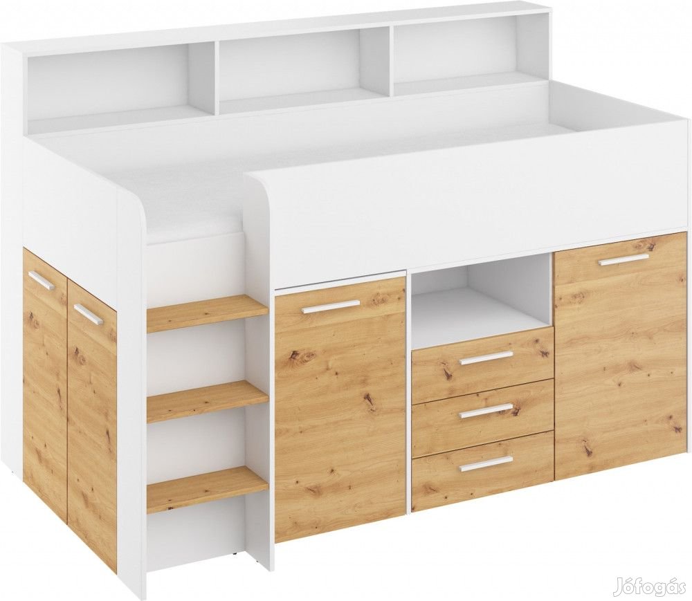 Balos, alacsony galériaágy lépcsővel, szekrényekkel, kihúzható íróasztallal, polcokkal és fiókokkal, matrac nélkül, fehér és artisan tölgy színben. További információkért kattintson ide: