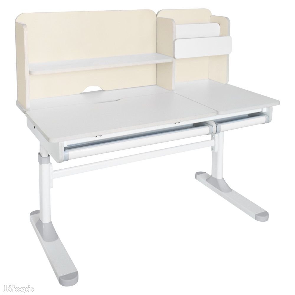 Anyag: laminált MDF/műanyag/fémMDF anyag vastagsága: 1,8 cmSzín: natúr/fehérAz asztallap ABS élekkel rendelkezikAsztal méretei (SzxMéxMa): 120x61x99-120 cmTalapzat szélessége: 110,5 cmHátsó panel méretei (SzxMa): 118,5x40 cmAz állítható asztallap mélysége: 40 cmA munkafelület magassága: 54-76 cmÁllítható munkalap-dőlésszögMunkalap dőlésszöge: 0-40Állítható lap szélessége: 80 cmAsztal teherbírása: 80 kgÁllítható asztalmagasságAz asztal magassága kézi hajtókar segítségével állíthatóA hajtókar a jobb vagy bal oldalra szerelhetőAz asztal magassága és a munkafelület dőlésszöge gázrugóval és karral állítható2 tágas fiók rekeszekkelKisebb fiókok teherbírása: 2 kgNagyobb fiókok teherbírása: 10 kgA hátlap polcokat, könyvtartót és kábelvezető nyílást tartalmazAz oldalon akasztó található, ahová táska akasztható4-16 éves korig alkalmas110-175 cm testmagasságú gyermekek és serdülők számáraSzétszerelve szállítva További információkért kattintson ide: