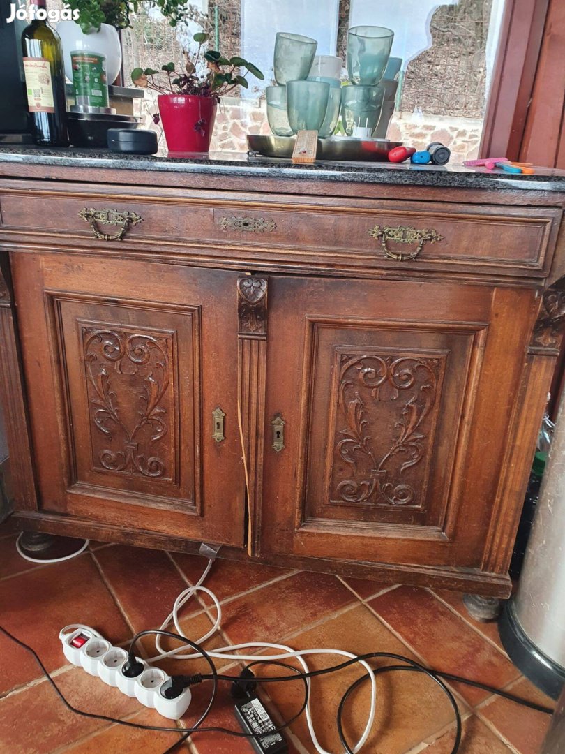 - Komód: sérült ajtóval (megvan a letörött rész is), márványlapra cserélt felső felülettel, legszélesebb része 90 cm, mélysége 55 cm, magassága 110 cm