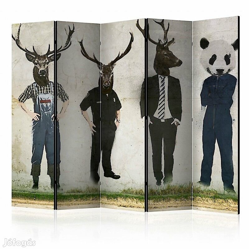 Az "Állatfejek embertesttel II" díszítő paraván egy kivételes része a modern beltereknek. A 5-részes, fából készült és kétoldalúan nyomtatott paraván nemcsak diszkréten elválasztja a teret, de hihetetlen megjelenést is biztosít a beltérnek. A tökéletes kivitelezés és a Full HD minőségű eredeti motívumok azt eredményezik, hogy a szobaparaván mindegyik beltér számára utánozhatatlan csábot biztosít. A beltéri díszparaván minden bizonnyal nagyszerű ötlet a helyiség díszítésére. Érdemes megemlíteni a praktikus alkalmazásukat is - a szobaparavánok használhatók pl. a kiteregetett ruhák eltakarására. Nagyon eredeti díszítőelem, mely mind lakásban, mind irodákban egyaránt használható, pl: fodrászszalonban, orvosi rendelőben vagy akár könyvelői irodában is.