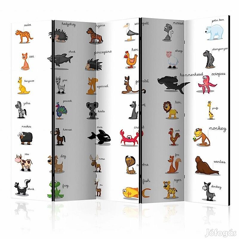 Az "Állatnevek angolul II" díszítő paraván egy kivételes része a modern beltereknek. A 5-részes, fából készült és kétoldalúan nyomtatott paraván nemcsak diszkréten elválasztja a teret, de hihetetlen megjelenést is biztosít a beltérnek. A tökéletes kivitelezés és a Full HD minőségű eredeti motívumok azt eredményezik, hogy a szobaparaván mindegyik beltér számára utánozhatatlan csábot biztosít. A beltéri díszparaván minden bizonnyal nagyszerű ötlet a helyiség díszítésére. Érdemes megemlíteni a praktikus alkalmazásukat is - a szobaparavánok használhatók pl. a kiteregetett ruhák eltakarására. Nagyon eredeti díszítőelem, mely mind lakásban, mind irodákban egyaránt használható, pl: fodrászszalonban, orvosi rendelőben vagy akár könyvelői irodában is.