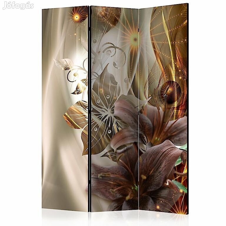 Az "Aranyliliom" díszítő paraván egy kivételes része a modern beltereknek. A 3-részes, fából készült és kétoldalúan nyomtatott paraván nemcsak diszkréten elválasztja a teret, de hihetetlen megjelenést is biztosít a beltérnek. A tökéletes kivitelezés és a Full HD minőségű eredeti motívumok azt eredményezik, hogy a szobaparaván mindegyik beltér számára utánozhatatlan csábot biztosít. A beltéri díszparaván minden bizonnyal nagyszerű ötlet a helyiség díszítésére. Érdemes megemlíteni a praktikus alkalmazásukat is - a szobaparavánok használhatók pl. a kiteregetett ruhák eltakarására. Nagyon eredeti díszítőelem, mely mind lakásban, mind irodákban egyaránt használható, pl: fodrászszalonban, orvosi rendelőben vagy akár könyvelői irodában is.
