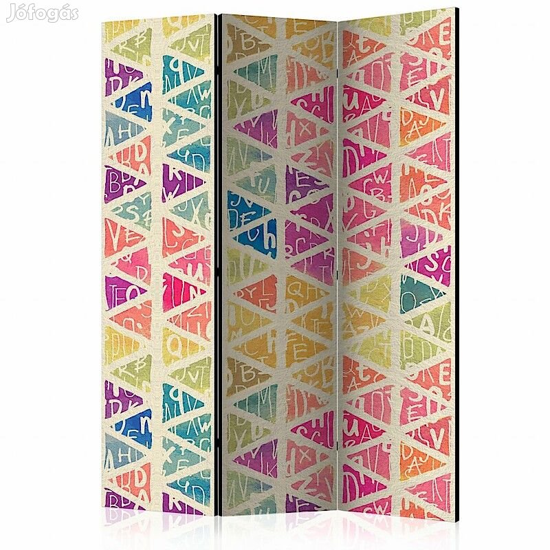 A "Betűk és háromszögek" díszítő paraván egy kivételes része a modern beltereknek. A 3-részes, fából készült és kétoldalúan nyomtatott paraván nemcsak diszkréten elválasztja a teret, de hihetetlen megjelenést is biztosít a beltérnek. A tökéletes kivitelezés és a Full HD minőségű eredeti motívumok azt eredményezik, hogy a szobaparaván mindegyik beltér számára utánozhatatlan csábot biztosít. A beltéri díszparaván minden bizonnyal nagyszerű ötlet a helyiség díszítésére. Érdemes megemlíteni a praktikus alkalmazásukat is - a szobaparavánok használhatók pl. a kiteregetett ruhák eltakarására. Nagyon eredeti díszítőelem, mely mind lakásban, mind irodákban egyaránt használható, pl: fodrászszalonban, orvosi rendelőben vagy akár könyvelői irodában is.