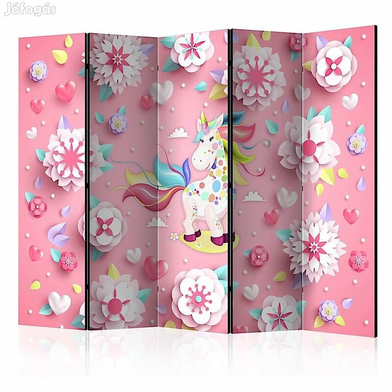 Az "Egyszarvú virágok között 2" díszítő paraván egy kivételes része a modern beltereknek. A 5-részes, fából készült és kétoldalúan nyomtatott paraván nemcsak diszkréten elválasztja a teret, de hihetetlen megjelenést is biztosít a beltérnek. A tökéletes kivitelezés és a Full HD minőségű eredeti motívumok azt eredményezik, hogy a szobaparaván mindegyik beltér számára utánozhatatlan csábot biztosít. A beltéri díszparaván minden bizonnyal nagyszerű ötlet a helyiség díszítésére. Érdemes megemlíteni a praktikus alkalmazásukat is - a szobaparavánok használhatók pl. a kiteregetett ruhák eltakarására. Nagyon eredeti díszítőelem, mely mind lakásban, mind irodákban egyaránt használható, pl: fodrászszalonban, orvosi rendelőben vagy akár könyvelői irodában is.