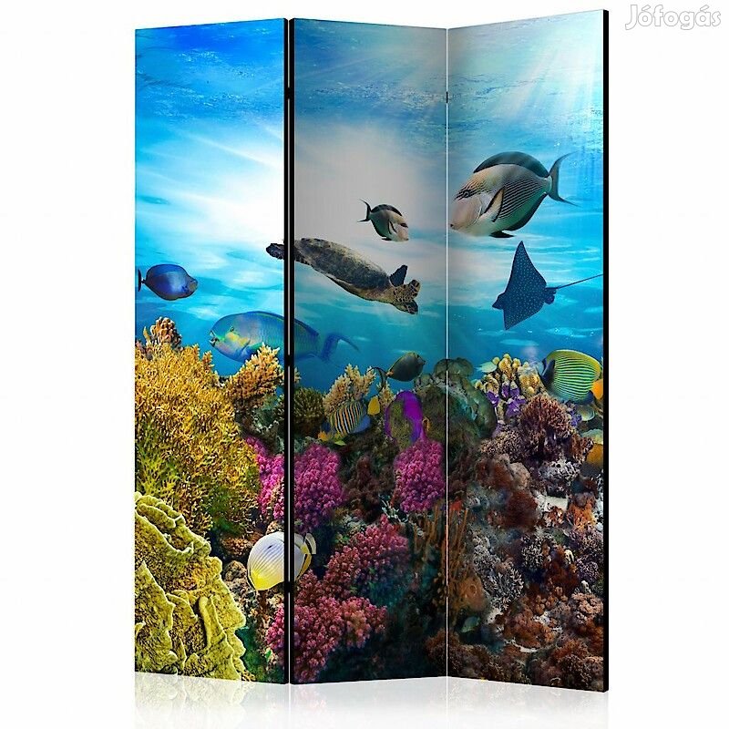 A "Korallzátony halakkal" díszítő paraván egy kivételes része a modern beltereknek. A 3-részes, fából készült és kétoldalúan nyomtatott paraván nemcsak diszkréten elválasztja a teret, de hihetetlen megjelenést is biztosít a beltérnek. A tökéletes kivitelezés és a Full HD minőségű eredeti motívumok azt eredményezik, hogy a szobaparaván mindegyik beltér számára utánozhatatlan csábot biztosít. A beltéri díszparaván minden bizonnyal nagyszerű ötlet a helyiség díszítésére. Érdemes megemlíteni a praktikus alkalmazásukat is - a szobaparavánok használhatók pl. a kiteregetett ruhák eltakarására. Nagyon eredeti díszítőelem, mely mind lakásban, mind irodákban egyaránt használható, pl: fodrászszalonban, orvosi rendelőben vagy akár könyvelői irodában is.