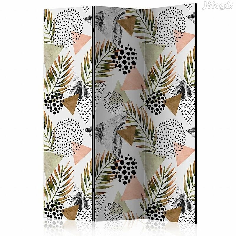 A "Trópusi geometria" díszítő paraván egy kivételes része a modern beltereknek. A 3-részes, fából készült és kétoldalúan nyomtatott paraván nemcsak diszkréten elválasztja a teret, de hihetetlen megjelenést is biztosít a beltérnek. A tökéletes kivitelezés és a Full HD minőségű eredeti motívumok azt eredményezik, hogy a szobaparaván mindegyik beltér számára utánozhatatlan csábot biztosít. A beltéri díszparaván minden bizonnyal nagyszerű ötlet a helyiség díszítésére. Érdemes megemlíteni a praktikus alkalmazásukat is - a szobaparavánok használhatók pl. a kiteregetett ruhák eltakarására. Nagyon eredeti díszítőelem, mely mind lakásban, mind irodákban egyaránt használható, pl: fodrászszalonban, orvosi rendelőben vagy akár könyvelői irodában is.
