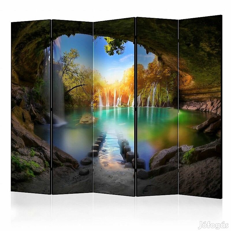 A "Türkiz tó II" díszítő paraván egy kivételes része a modern beltereknek. A 5-részes, fából készült és kétoldalúan nyomtatott paraván nemcsak diszkréten elválasztja a teret, de hihetetlen megjelenést is biztosít a beltérnek. A tökéletes kivitelezés és a Full HD minőségű eredeti motívumok azt eredményezik, hogy a szobaparaván mindegyik beltér számára utánozhatatlan csábot biztosít. A beltéri díszparaván minden bizonnyal nagyszerű ötlet a helyiség díszítésére. Érdemes megemlíteni a praktikus alkalmazásukat is - a szobaparavánok használhatók pl. a kiteregetett ruhák eltakarására. Nagyon eredeti díszítőelem, mely mind lakásban, mind irodákban egyaránt használható, pl: fodrászszalonban, orvosi rendelőben vagy akár könyvelői irodában is.