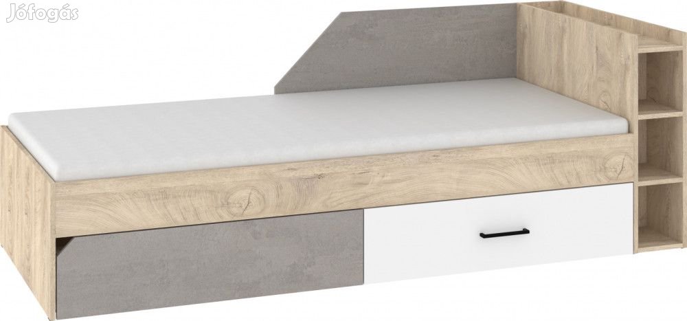 Jobbos ágykeret polcos fejtámlával, háttámlával, ágyráccsal, és 2 kihúzható ágyneműtartó fiókkal, matrac nélkül, endgrain tölgy, fehér és beton szürke színben. További információkért kattintson ide: