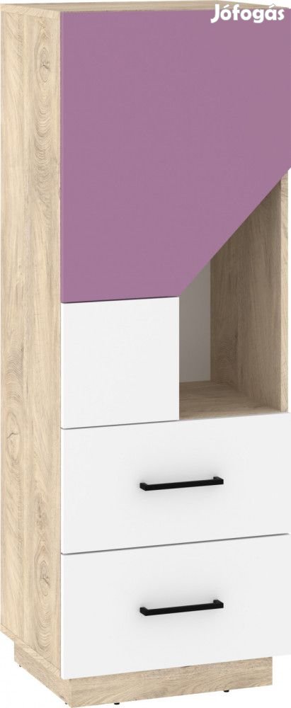 Alacsony könyvespolc 2 ajtóval, 2 fiókkal és polcokkal, endgrain tölgy, fehér és levendula színben. További információkért kattintson ide: