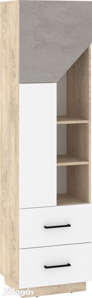 Magas könyvespolc 2 ajtóval, 2 fiókkal és polcokkal, endgrain tölgy, fehér és beton szürke színben. További információkért kattintson ide: