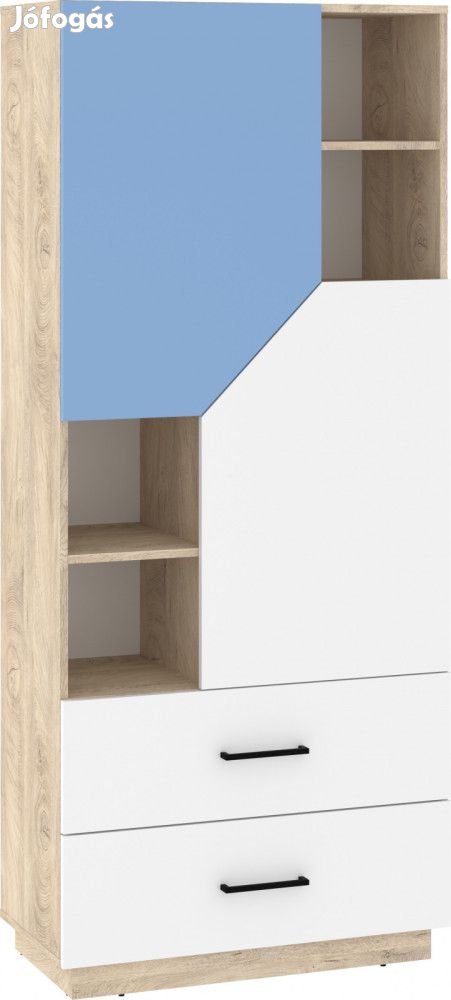 Magas könyvespolc 2 ajtóval, 2 fiókkal és polcokkal, endgrain tölgy, fehér és világoskék színben. További információkért kattintson ide: