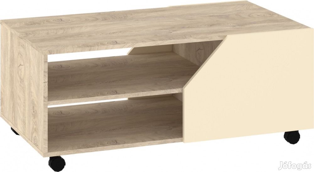 Görgős dohányzóasztal nyitott polcokkal és téglalap alakú szögletes asztallappal, endgrain tölgy és krém színben. További információkért kattintson ide: