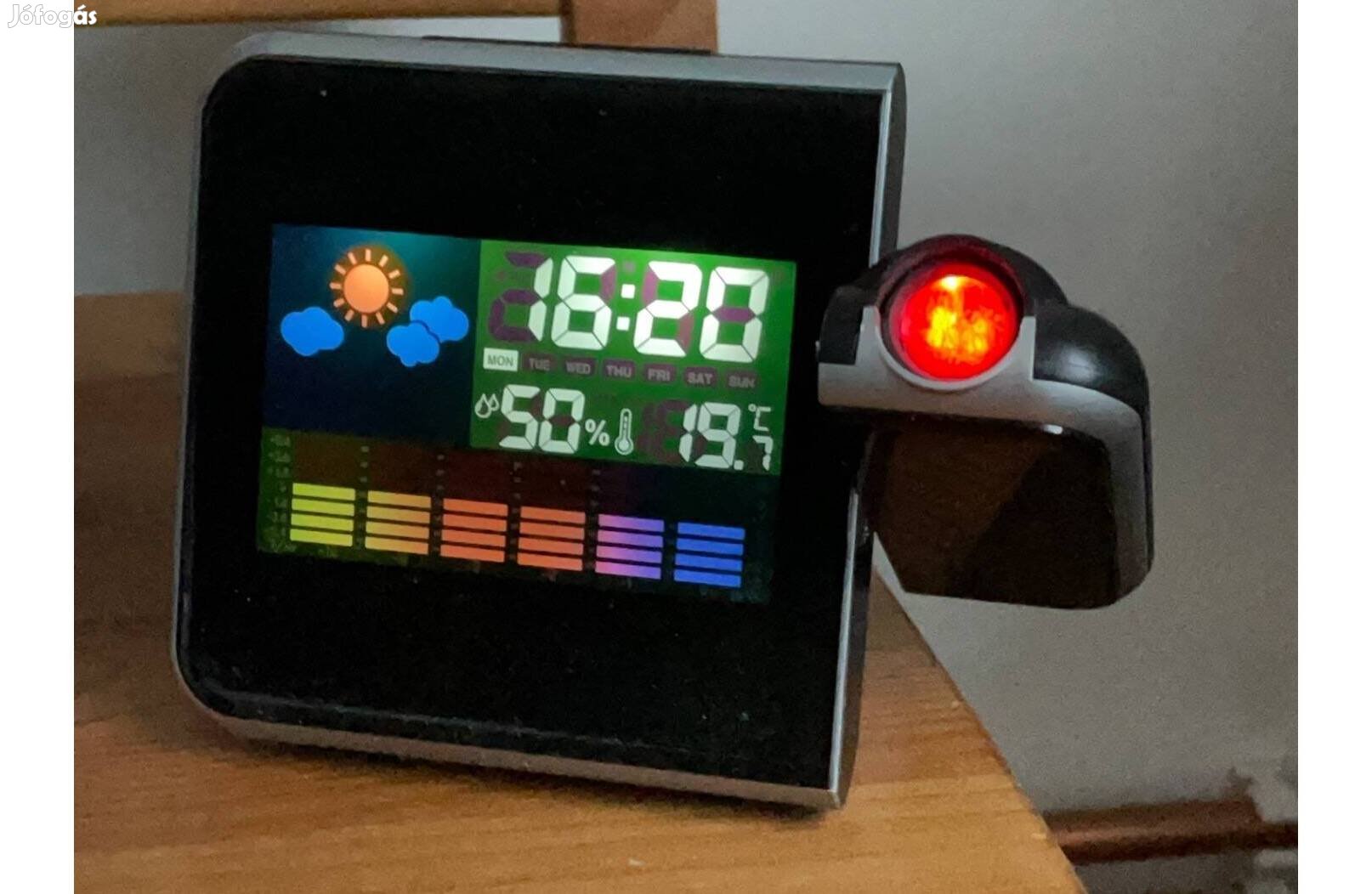 elado egy projektoros ébresztöóra. A projektor 130°-ban elforgatható. Az időt a falra vagy a mennyezetre vetítheted. Ébresztő szundi móddal. Kijelelzi a szobahömérsékletet és páratartalmat, valamint a legnyomast. Hálozati adapterrel, a 2 x AAA elem áthidalja az áramkimaradást