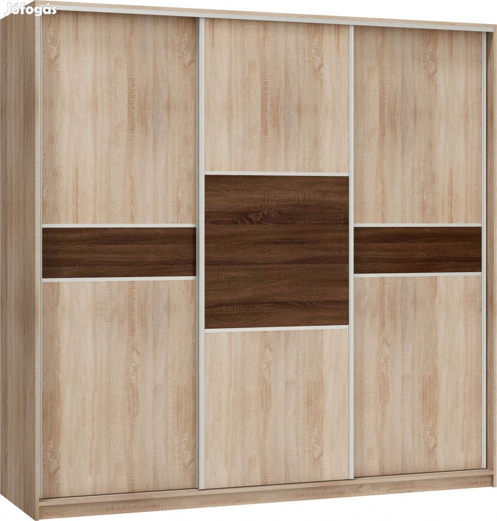 220 cm széles 3-ajtós tolóajtós gardróbszekrény, egyik oldalon alul-felül polccal és akasztórúddal, középen felül polccal, alatta két akasztórúddal, másik oldalon végig polcokkal, világos sonoma tölgy és sötét sonoma tölgy színben. További információkért kattintson ide: